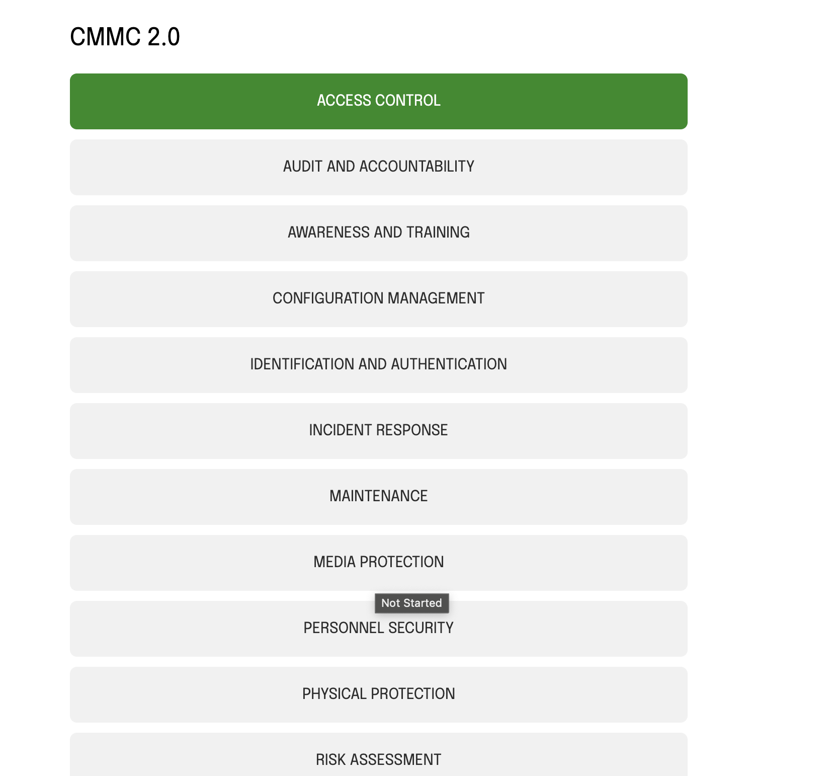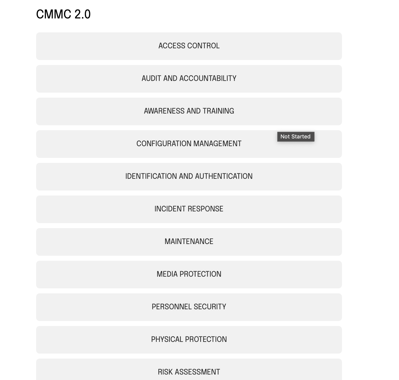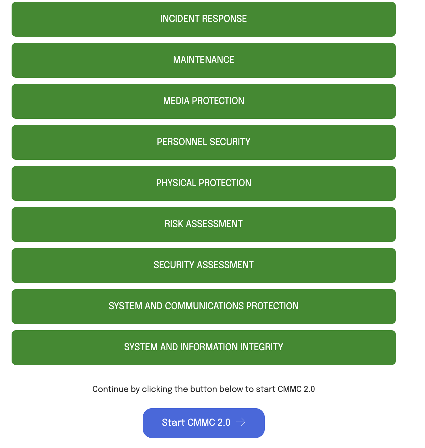 Select the cybersecurity standard/Framework you want to assess your organization for, eg CMMC for government contractors.